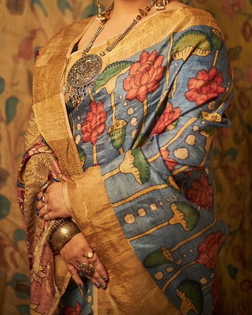 Цветочные мотивы занимают особое место в индийской вышивке. Среди них лотос — самый узнаваемый и многозначный символ. Он встречается в Кантхе, Чиканкари, Каламкари, на сари Пайтани. Для индийцев лотос — воплощение женственности, чистоты сердца, плодородия и гармонии. Его образ связан с богиней Лакшми, поэтому вышитый лотос часто несёт пожелание процветания и удачи.