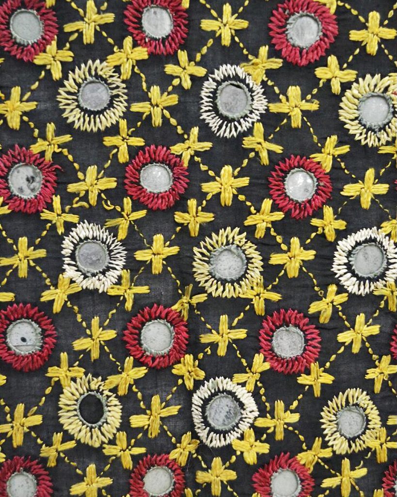 Особенное место занимает зеркальная вышивка — shisha. Маленькие зеркальца, пришитые к ткани, отражают свет и, по народным представлениям, отталкивают дурные взгляды. В Пенджабе этот стиль называют Shishedar Phulkari, в Гуджарате — просто shisha. Это один из самых узнаваемых индийских приёмов, создающий магический блеск.