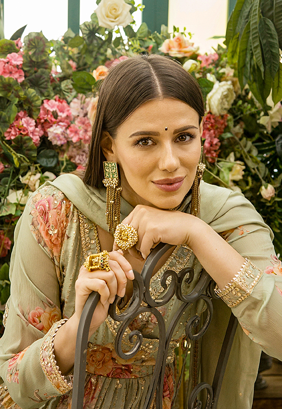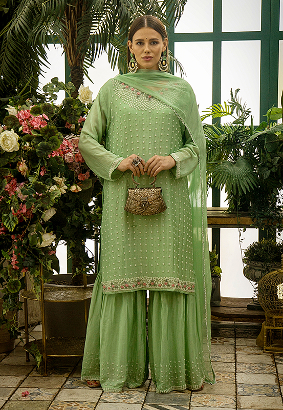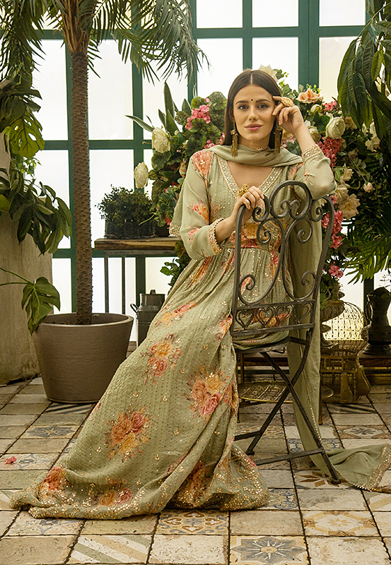 Тёплый зелёный наряд с розовыми мотивами и вышивкой Мукаиш. Асимметричная застёжка придаёт изысканность, а дупатта завершает образ.