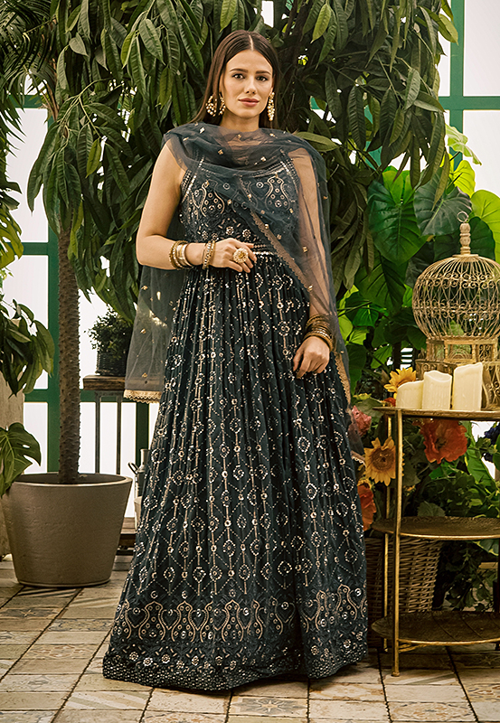 Платье курта сине-зелёного цвета из натурального шёлка украшенного золотой вышивкой в технике готапатти. В комплекте палантин-дупатта с золотой отделкой.